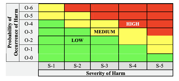 Provide a copy of the Risk Chart, which specifies the Risk Acceptability levels for the product in the submission, and include copies of the definitions of Severity Levels and the Probability of Occurrence Levels.
